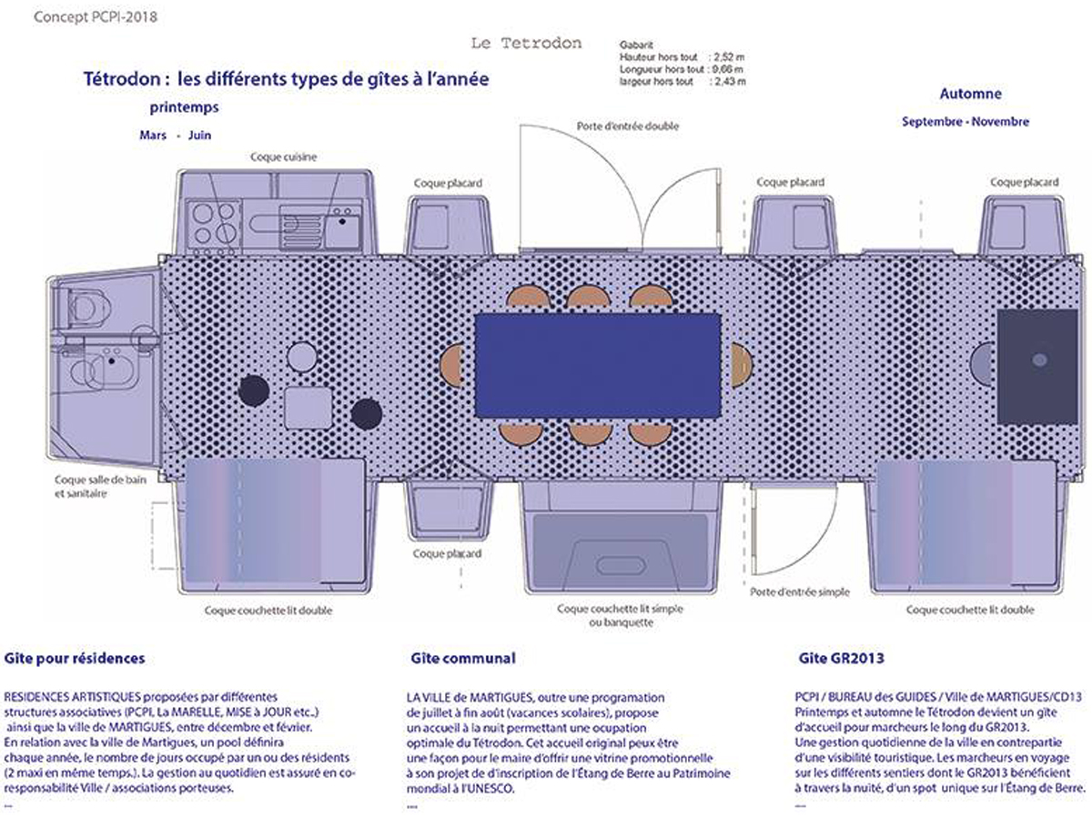 Inhabitable space, the Tétrodon will offer residences to artists, from the Etang de Berre to the Golfe de Fos. These residences can be extended to experts, researchers, architects, designers, participating in the creation of a laboratory / observatory of the territories.